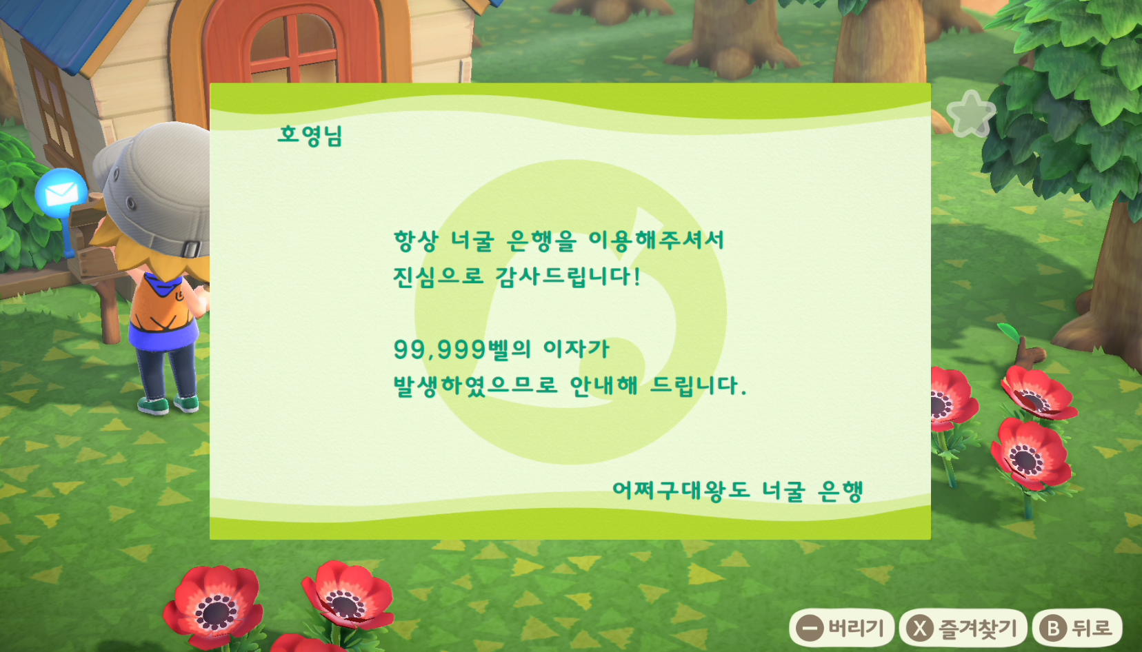 9.게임에 재접속후 우편함에 가셔서 너굴은행 편지를 열어보면 99,999원이 들어와 있습니다.~~이야~~대단해 ㅎㅎ