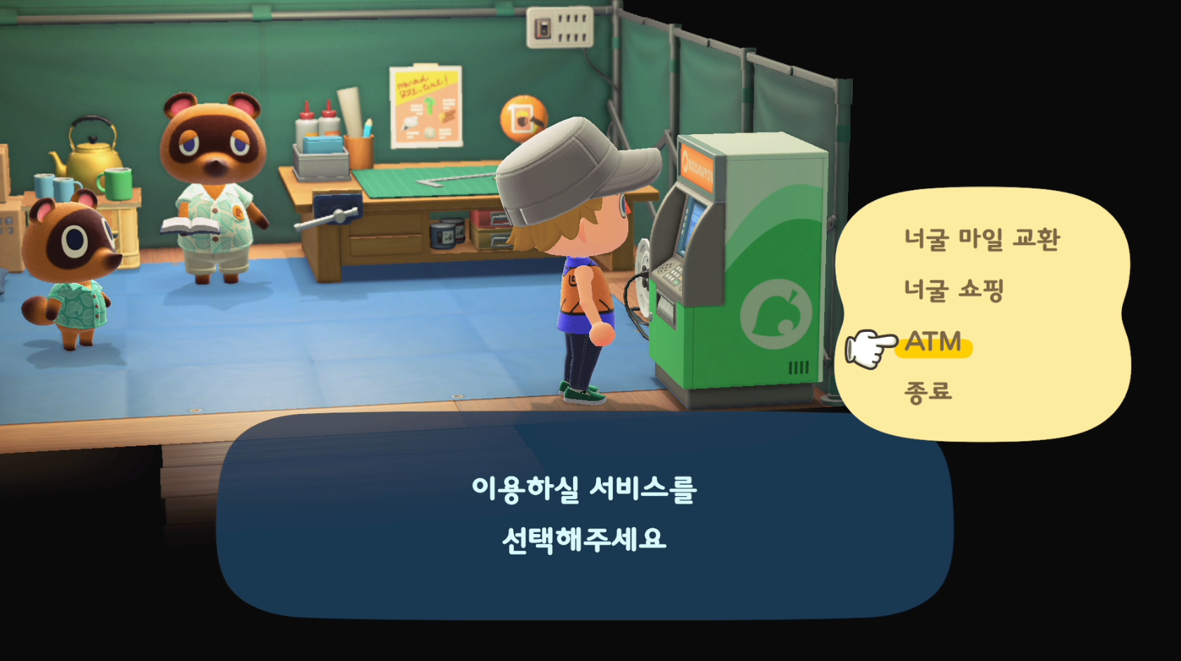 우선 너굴텐트에 가면 ATM 기계가 있어요. 기계에 가지고 있는 모든 돈을 입금해 주세요.